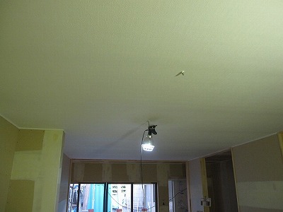 クロス工事が進んでいます。 天井を張り終わった状態です。 あと2日ぐらいでクロス工事は終わり、 土間のタイル工事と入っていきます。